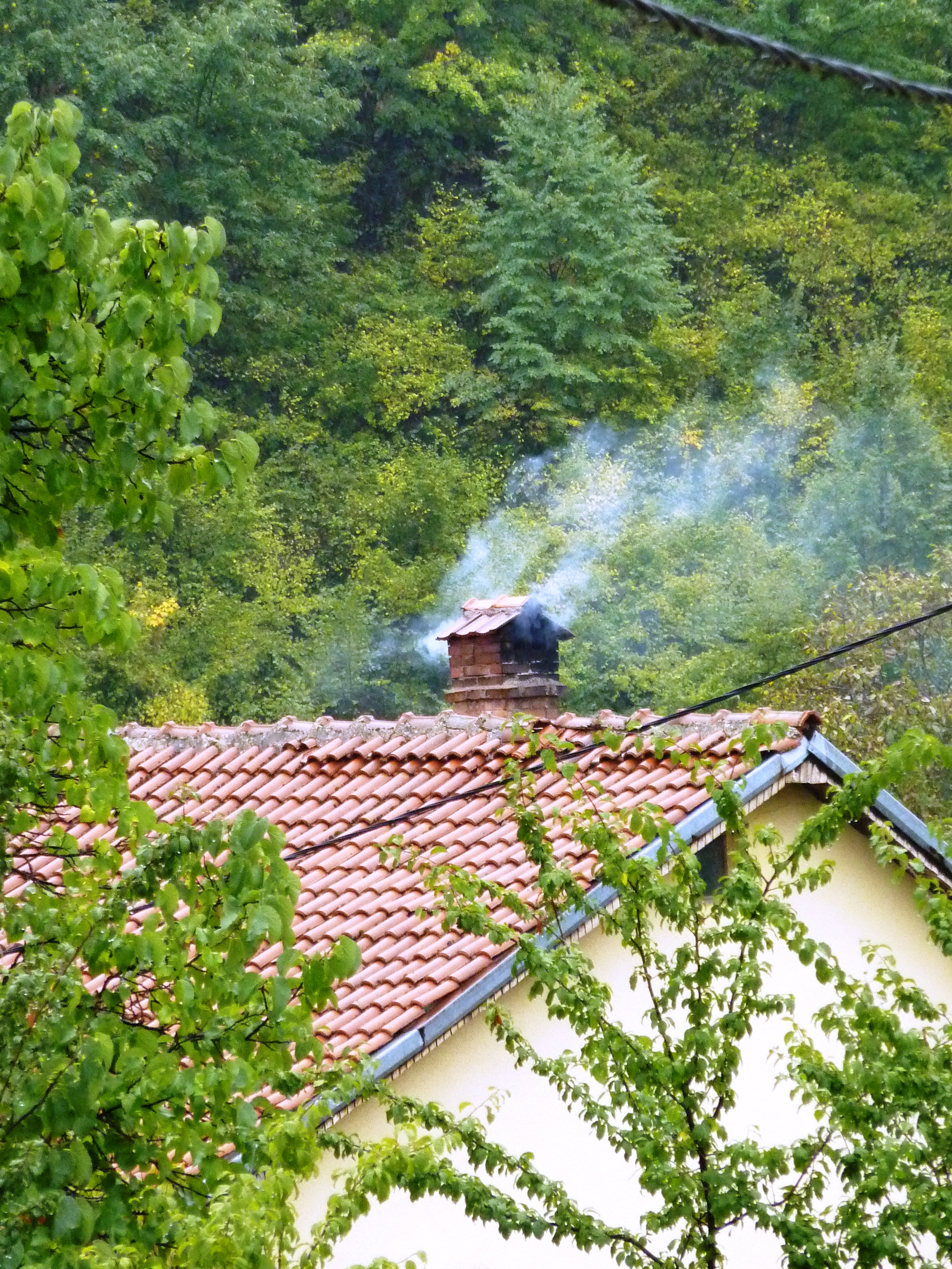 This weekend I was in Dihovo when Macedonia’s summer-like weather abruptly ended as rain fell and the temperature dramatically dropped. This brisk change served to enhance the village’s beauty as the dark sleek colors of stones emerged and the aroma of wood burning stoves, roasting red-peppers, and slow-cooking meat dishes filled the air. Walking the streets with my collar-up and umbrella opened, here is a bit of what I was lucky enough to enjoy this weekend in Dihovo. There is an emphasis on the chimneys that warmed the homes and my heart: