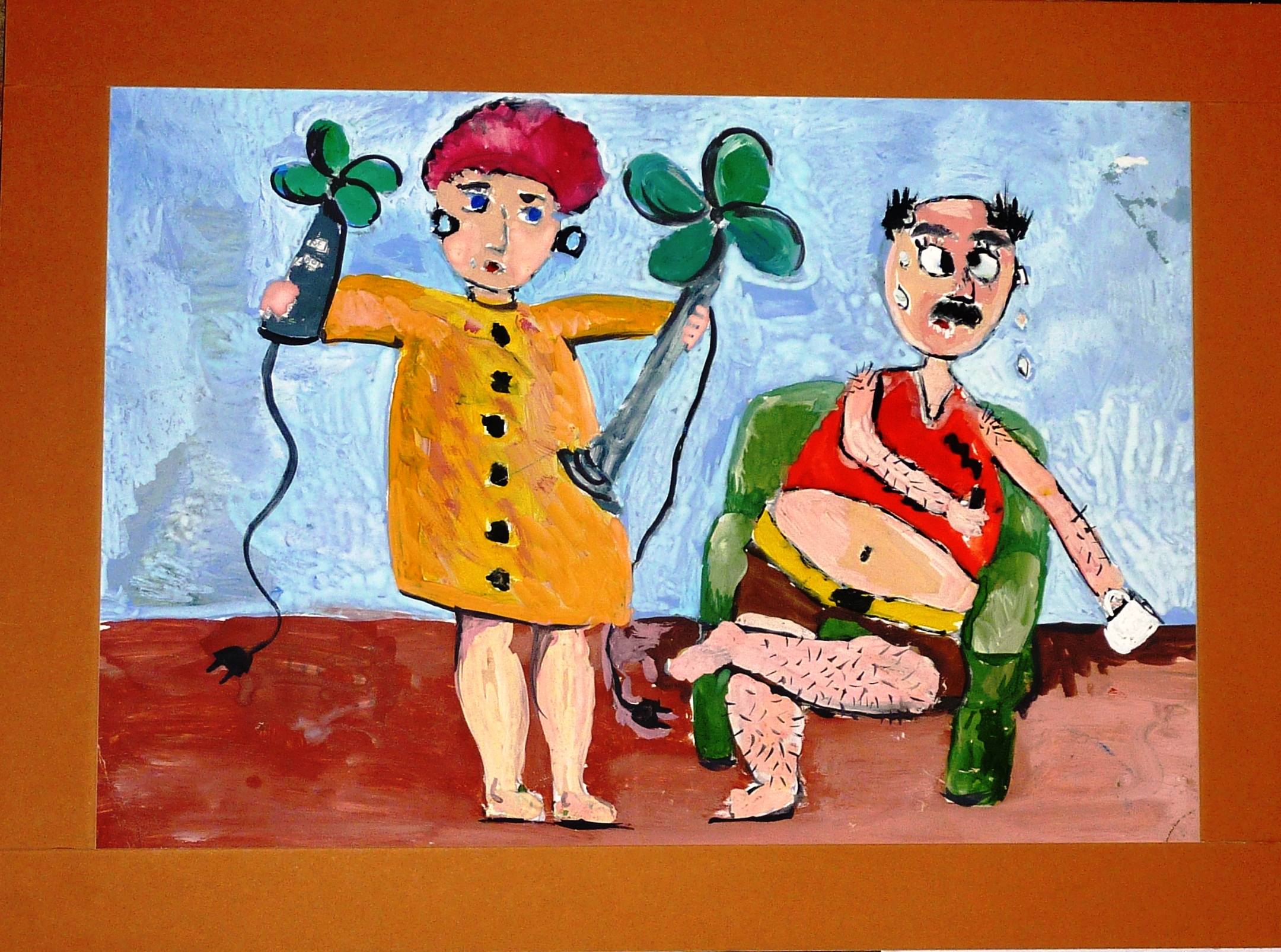 2. I like the lady trying to fan off her hairy husband with fans that aren’t plugged in. I especially like her earrings and how they depicted the hair on the man. too funny. What age group is this?